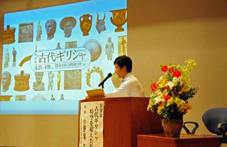 講演は、エーゲ海を囲む国々や島々の地図と古代ギリシャの年表が記されたレジュメを基に、鮮明な映像での作品の解説で進みました。映像の作品は、学校時代の教科書などで目にしたものが数点ありましたが、当然ながらほとんどは初めて目にする作品ばかりでした。