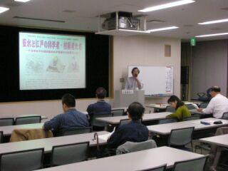 取り上げられた江戸時代の科学者・技術者は70人以上で、千住ゆかりの藍水、宇田川三代、名倉直賢(初代)、橋本律蔵、大原利明等往時の千住の文化のレベルの高さも実感した。各日の質問も専門的でまた受講者の中から講義を補足する説明も行われたり区民大学塾講座として独特な場面もあった。当会の多くの会員が参加したことを付記します。(酒井政雄)