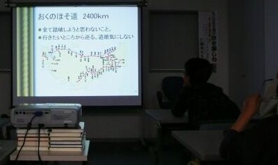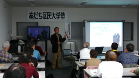 「おくのほそ道の旅を楽しむ」はNPO法人千住文化普及会代表理事 櫟原文夫氏を講師に11月7日、14日各金曜日午後7時〜9時、研修室4において行われた。受講応募者が当初はなかなか集まらなかったがチラシをネットワークを利用して配布したり、他の講座で配布するなどPRに努めた結果、募集定員30名に対し38名の応募、キャンセルを除いた35名が受講された。