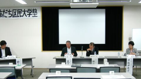 午後の部前半は、荒昌二郎氏(ふるさと学舎)、櫟原文夫氏(千住文化普及会)、早坂津夜子氏(楽学の会)、コーディネーター、鈴木章生氏によるパネルディスカッションが行われた。荒氏は、伝統文化の横のつながりを創り、文化の出前をおこなう話。櫟原氏は子ども達に心の故郷を作り、文化・歴史のイベントを通して、町おこしに貢献する話。早坂氏は、大学塾について話した。