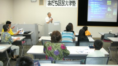 講座は、天文愛好家である小島一浩氏(足立区在住)が「太陽、月、惑星のはなし」、楽学の会会員の小林徹が「ロケット、人工衛星、宇宙船のはなし」を担当して行いました。特に、小島氏はご自身の天体望遠鏡で撮影された月、火星、木星、土星などの映像を紹介して講義していただきました。