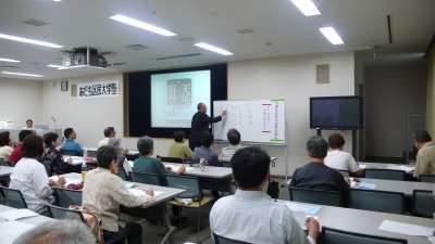 講座内容は没後20年目に当たり、再び脚光を浴びている高名、人気作家の池波正太郎を取上げ、その人間形成と主な作品群を豊富な資料と映像を駆使して成功裏に終了した。当初予定の30名募集に対して応募者が多く会場も生涯学習センターの好意により、1回目は研1,3回目は講堂で開催。3回とも炎天下にも関わらず受講者の皆様が足を運んで下さり感謝の至りです。また教室に依って機器操作が違うので機器担当の運営ボラも苦労された。大学塾は会員の総力戦であることを改めて認識した。 (安藤寿)