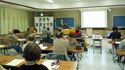 テレビ放映の効果もあり、応募者43名・受講者38名と、定員の30名をゆうに超す盛況さであった。飛び入りの受講者が4名もおいでになったことは、地域学習センターで開催の良い面が表れたことであり、「地域協働講座」の将来に、明るい兆しが感じられた。また、運営スタッフの人数は、地域センター職員を含め5名と少人数であったが、連携良く円滑に進行できたことは、地域学習センターとの連携を強めることにより、講座開催チャンスの拡大に期待感が持てるものであった。