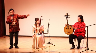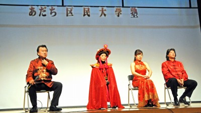出演者(司会と語りの程波さんに加え、趙正達・玉晶・劉妍さんたち)の熱演と珍しい出し物(二胡・フルス・バーウー・中阮・擂琴の中国楽器紹介と演奏、京劇・変面の実演)が功を奏し、好評の内に終了出来て関係者一同胸を撫で下ろしました。区民還元の特別講演会として中国文化のほんの一端を足立区の方々に紹介し、喜んで頂けたのかな、と自負しているところです。(鹿島健一)