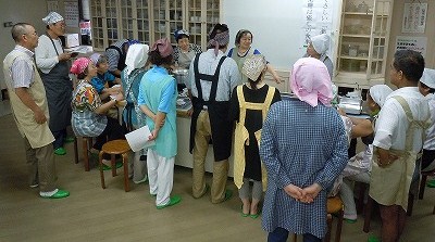 受講者は14名で、2回目は料理実習であった。男性1名の受講者があり、15名とスタッフ6名が5班に分かれて調理に挑戦した。各班の男性達は熱心で手さばきもよく、その姿はほほ笑ましく感じられた。出来上がりは色取りも良く美味しいとの評価であった。