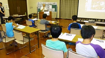 子供たち向けの夏休み科学講座を8月4日(土)午後1時30分〜3時30分に東和地域学習センターの研修室で実施しました。今回は宇宙に興味のある、小学校4年〜6年生を対象に、地球の誕生と太陽系の惑星の話、みんなの周りの宇宙の技術(ロケット、人工衛星、宇宙船、宇宙旅行など)の話をわかりやすく、理解してもらうことを目的に開催。講師は小林 徹氏(元(財)無人宇宙実験システム研究開発機構研究員)が映像を交えて解説して頂き子供たちは映像を見ながら興味深く聞いていました。特に今回は5月21日の金環日食、土星が月に隠れる土星食の映像を紹介頂き宇宙の不可思議を体感しました。