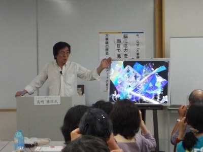 1回目「感動とは何か!」美しいものを見たとき人は感動する。その感動の心を忘れると認知症になるという。両目で見る「万華鏡」を覗けば「美の世界」が広がり、「脳」が活性化する。今回、取り上げたのは、健脳的万華鏡(ヒーリングスコープ)。この事は東京電機大学との共同研究で実証された。会場には、講師の作成した「世界最大の万華鏡」など、6点が設置された。覗いた受講者は、美しさに魅せられ感動で涙を流している方も見受けられた。また、講師の母親は100歳を超えて、眼鏡も杖・補聴器も必要ないという。