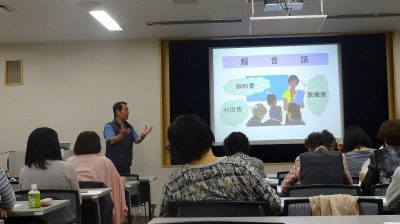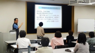 第2回目:相手に分かりやすく伝えるためには、しっかりとした発声、はっきりとした発音、分かりやすい速度、ポーズ、抑揚、強調であること。この回でトレーニングを試みた。声が小さい一人の受講者に、まず強い無声音で単文を読んでもらい、次にそのまま声を出して読んでもらったところ、一瞬にして変わったことに拍手が起こった。