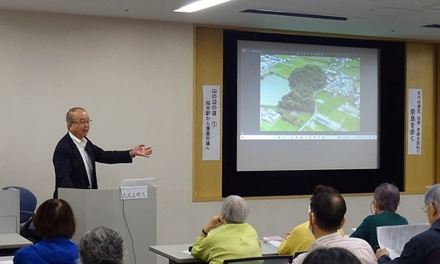 第1回は、山の辺の道とは、日本書記に存在が確認されている1300年以上の歴史がある“日本最古の官道である”。“山辺の道”は奈良市街まで続くが、桜井から天理までの一般コースは16㎞である。箸墓古墳は大きささでは全国で11番目、奈良県下では、3番目の規模を持つ。過去に5回の発掘調査がおかなわれており、出土土器の検討により前方部が布留0(ゼロ)式期(4世紀初め)の築造であるとされるこの古墳は邪馬台国の嬢王「卑弥呼」の墓という邪馬台国畿内説でも有名である。仏教伝来、金谷の石仏、大神神社、桧原神社が紹介された。