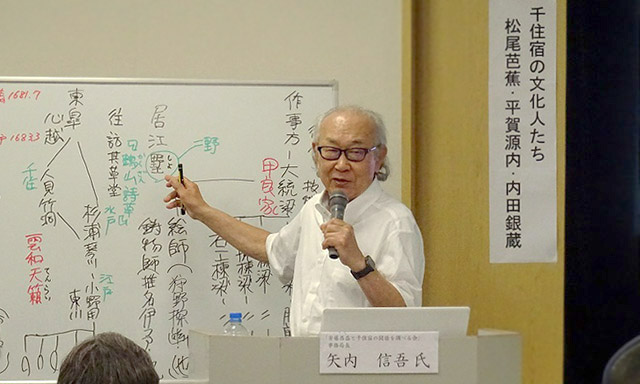 第3回は、「千住の文化人たち」として、「甲良家の人々と甲良屋敷」では徳川家に登用された甲良家が日光東照宮の創立や補修を担当したこと。田村藍水は甲良家から屋敷を譲渡されて朝鮮人参を栽培、藍水の弟子に平賀源内がいて「薬品会」を開催したことなどが重ねて紹介された。松尾芭蕉は