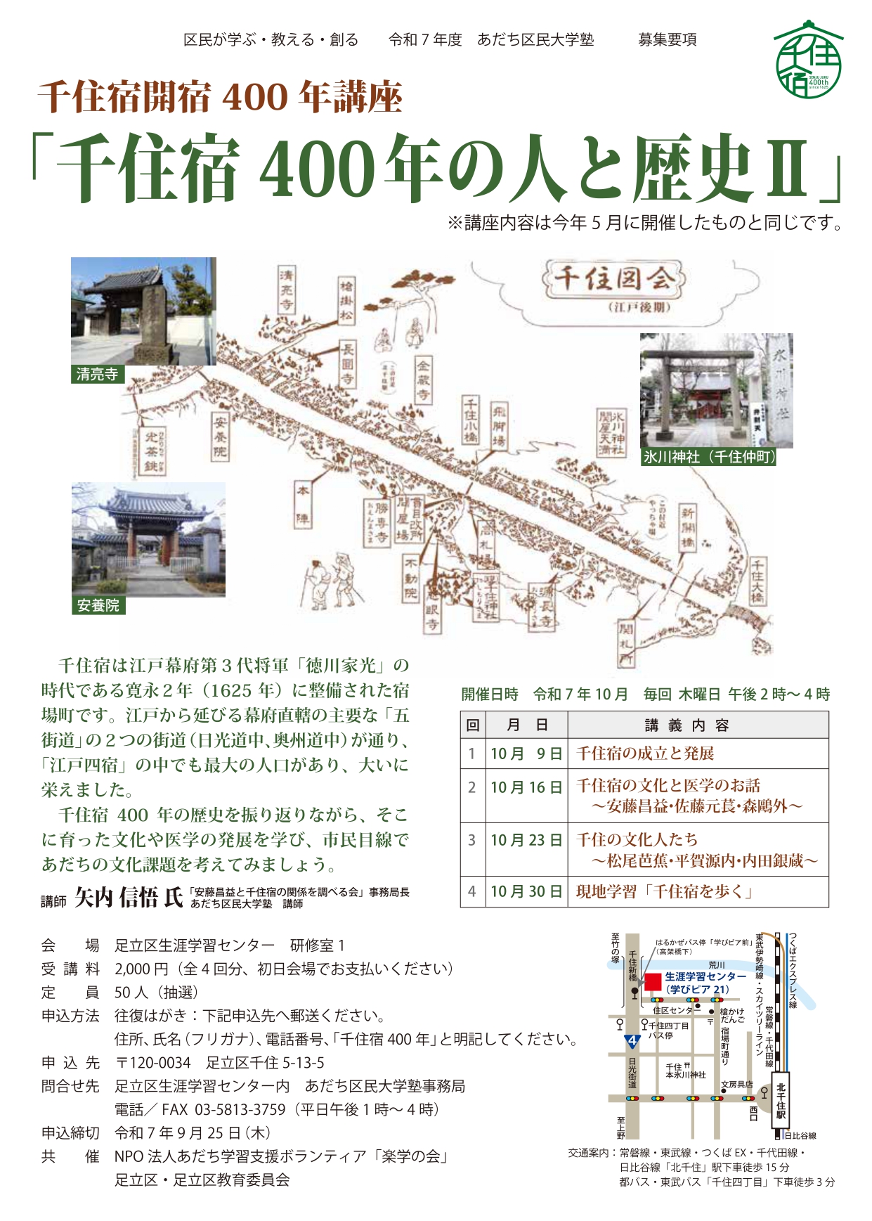 矢内講師は令和2年度に「千住の文化人 安藤昌益から佐藤元萇・森鷗外へ」の講座を担当していただいたが、今回は「千住宿400年講座『千住宿400年の人と歴史』」として5年間のご研究の進捗と千住宿400年の 歴史を興味深く講義していただいた。改めて感謝の意を表したい。 (糸井史郎)
