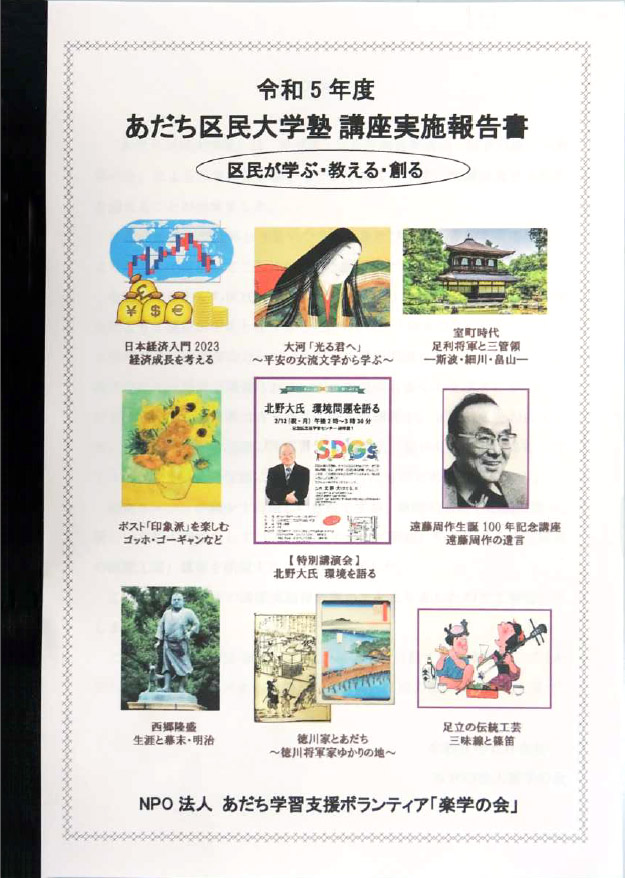 講座実施報告書は、足立区地域文化課 生涯学習支援課長 江連嘉人氏、足立区教育委員会教育長 中村明慶氏, 足立区総務部長 松野美幸氏、に報告書を持参、事業が無事に遂行できましたことのご報告を致しました。