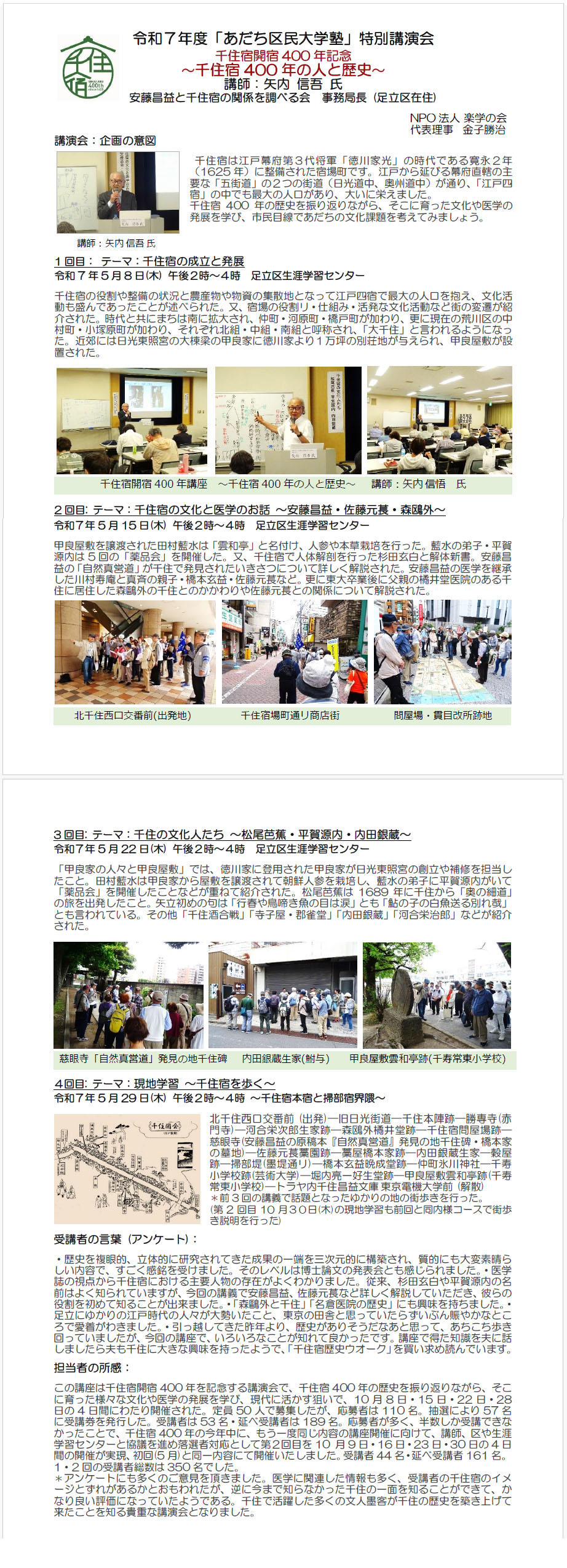 千住宿開宿400年記念事業として開催いたしました『千住宿 400 年の人と歴史』報告書を、令和8年2月15日(綾瀬プルミエ)にて、開催されるあらかわ学会年次大会に寄稿いたしました。寄稿文は論文として採用され 2025 講演論文集に掲載されました。論文集は文献登録され、公文書として国立国会図書館・東京都立図書館ほかに、寄贈・保管されます。